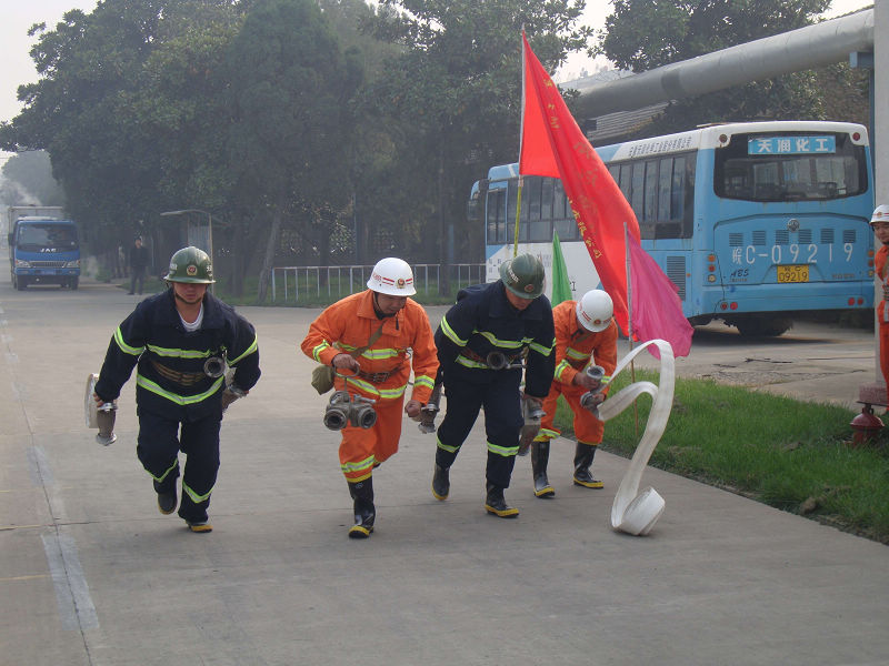 參加演練活動的有各部門、分廠及公司外協(xié)施工單位等200余人。演練前,公司消防員組織演練人員參觀“11.9”消防安全宣傳板報,向他們講解滅火器的使用方法和適用范圍、防化服的穿著和空氣呼吸器的使用方法及火災(zāi)發(fā)生后如何逃生等。接著,公司消防隊員演示了明火撲救、兩盤水帶的連接和出水以及五盤水帶連接和出水。最后,各部門、分廠及施工單位進行了明火撲救,應(yīng)急逃生等演練。