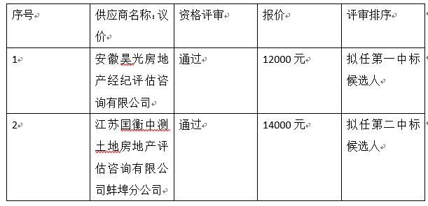 高鐵蚌埠南站西廣場、蚌投科技園物業(yè)服務(wù)費(fèi)評估項目于2021年10月18日發(fā)布招標(biāo)公告,經(jīng)兩次流標(biāo),第三次招標(biāo)公共于2021年11月04日發(fā)布,2021年11月11日9:00本項目開標(biāo),三家報名現(xiàn)場兩家參與,按招標(biāo)文件要求現(xiàn)場議價,經(jīng)過專家評審,經(jīng)與投標(biāo)單位溝通均表示不再下浮,按招標(biāo)文件要求符合議價程序?,F(xiàn)公告排名如下: